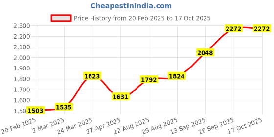 The current price is ₹2,272, which is ₹768.47 (51.1%) higher than the best price of ₹1,503.53 last seen on 20 Feb 2025. Over the 238 day price history period, prices have ranged from ₹1,503.53 to ₹2,272, with an average of ₹1,856. The pricing shows moderate volatility, but the overall trend is concerning as prices are getting more expensive. In terms of recent activity, there have been 0 price changes this week, 0 this month, and 7 over the past year. Consider waiting before making a purchase as prices are rising and better deals may be available later.