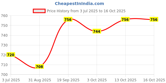 The current price is ₹756, which is ₹48 (6.8%) higher than the best price of ₹708 last seen on 31 Aug 2025. Over the 104 day price history period, prices have ranged from ₹708 to ₹756, with an average of ₹740. The pricing has been quite stable with low volatility, with prices remaining relatively stable overall. In terms of recent activity, there have been 0 price changes this week, 2 this month, and 4 over the past year. If you need this product now, it's a reasonable time to buy as prices are stable, but you might want to monitor for potential better deals.