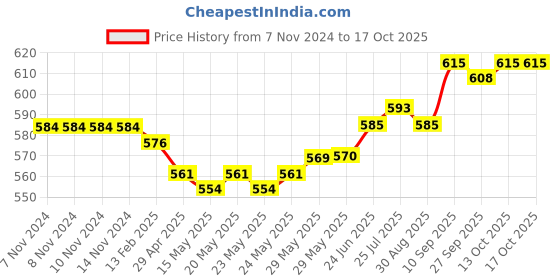 The current price is ₹615, which is ₹60.74 (11.0%) higher than the best price of ₹554.26 last seen on 15 May 2025. Over the 343 day price history period, prices have ranged from ₹554.26 to ₹615, with an average of ₹582. The pricing has been quite stable with low volatility, but the overall trend is concerning as prices are getting more expensive. In terms of recent activity, there have been 0 price changes this week, 1 this month, and 17 over the past year. If you need this product now, it's a reasonable time to buy as prices are stable, but you might want to monitor for potential better deals.