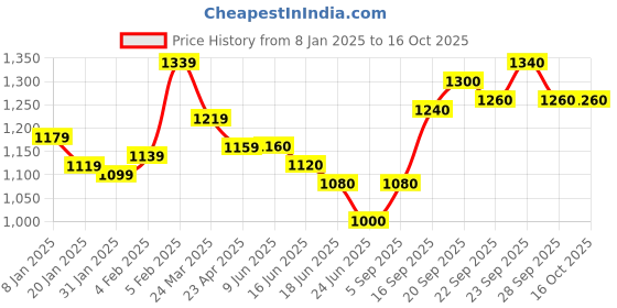 The current price is ₹1,260, which is ₹260 (26.0%) higher than the best price of ₹1,000 last seen on 24 Jun 2025. Over the 281 day price history period, prices have ranged from ₹1,000 to ₹1,340, with an average of ₹1,186. The pricing shows moderate volatility, but the overall trend is concerning as prices are getting more expensive. In terms of recent activity, there have been 0 price changes this week, 3 this month, and 16 over the past year. If you need this product now, it's a reasonable time to buy as prices are stable, but you might want to monitor for potential better deals.