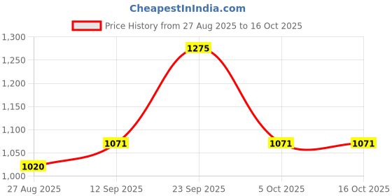 The current price is ₹1,071, which is ₹51 (5.0%) higher than the best price of ₹1,020 last seen on 27 Aug 2025. Over the 50 day price history period, prices have ranged from ₹1,020 to ₹1,275, with an average of ₹1,102. The pricing shows moderate volatility, with prices remaining relatively stable overall. In terms of recent activity, there have been 0 price changes this week, 1 this month, and 3 over the past year. The price direction is uncertain, so monitor the situation for a few more days before making a decision.