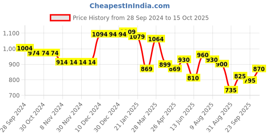 The current price is ₹870, which is ₹135 (18.4%) higher than the best price of ₹735 last seen on 31 Aug 2025. Over the 382 day price history period, prices have ranged from ₹735 to ₹1,109.26, with an average of ₹943. The pricing shows moderate volatility, and the overall trend is favorable for consumers as prices are getting cheaper. In terms of recent activity, there have been 0 price changes this week, 1 this month, and 24 over the past year. If you need this product now, it's a reasonable time to buy as prices are stable, but you might want to monitor for potential better deals.