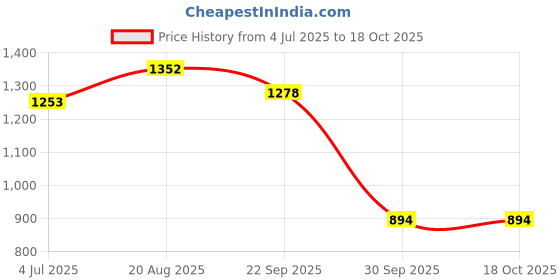 Great news for shoppers! The current price of ₹894 is at its best ever level. Over the 106 day price history period, prices have ranged from ₹894 to ₹1,352, with an average of ₹1,134. The pricing shows high volatility with significant fluctuations, and the overall trend is favorable for consumers as prices are getting cheaper. In terms of recent activity, there have been 0 price changes this week, 1 this month, and 3 over the past year. This is an excellent time to make a purchase as prices are trending downward and conditions appear favorable.