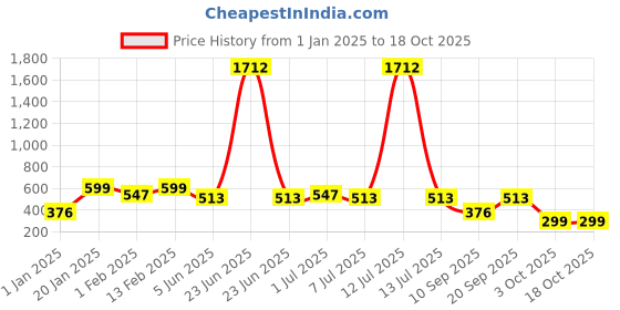 Good news! The current price of ₹299 is at its best ever level. Over the 290 day price history period, prices have ranged from ₹299 to ₹1,712, with an average of ₹642. The pricing shows high volatility with significant fluctuations, and the overall trend is favorable for consumers as prices are getting cheaper. In terms of recent activity, there have been 0 price changes this week, 1 this month, and 13 over the past year. This is an excellent time to make a purchase as prices are trending downward and conditions appear favorable.