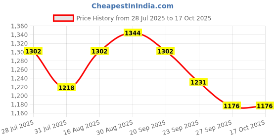 Great news for shoppers! The current price of ₹1,176 is at its best ever level. Over the 80 day price history period, prices have ranged from ₹1,176 to ₹1,344, with an average of ₹1,256. The pricing has been quite stable with low volatility, and the overall trend is favorable for consumers as prices are getting cheaper. In terms of recent activity, there have been 0 price changes this week, 2 this month, and 6 over the past year. If you need this product now, it's a reasonable time to buy as prices are stable, but you might want to monitor for potential better deals.