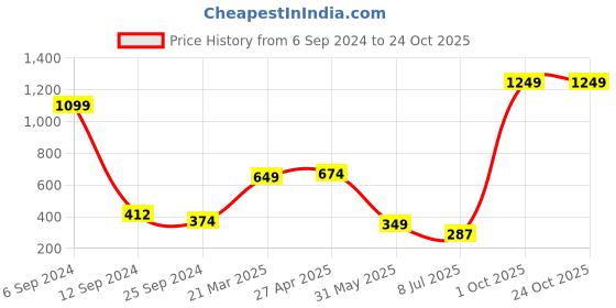 The current price is ₹1,249, which is ₹962 (335.2%) higher than the best price of ₹287 last seen on 8 Jul 2025. Over the 413 day price history period, prices have ranged from ₹287 to ₹1,249, with an average of ₹705. The pricing shows high volatility with significant fluctuations, but the overall trend is concerning as prices are getting more expensive. In terms of recent activity, there have been 0 price changes this week, 0 this month, and 4 over the past year. Consider waiting before making a purchase as prices are rising and better deals may be available later.