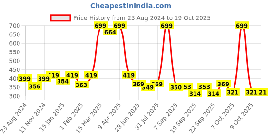 The current price is ₹321, which is ₹7 (2.2%) higher than the best price of ₹314 last seen on 19 Sep 2025. Over the 421 day price history period, prices have ranged from ₹314 to ₹699, with an average of ₹428. The pricing shows high volatility with significant fluctuations, and the overall trend is favorable for consumers as prices are getting cheaper. In terms of recent activity, there have been 0 price changes this week, 7 this month, and 22 over the past year. This is an excellent time to make a purchase as prices are trending downward and conditions appear favorable.