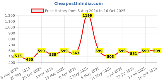 The current price is ₹599, which is ₹144 (31.6%) higher than the best price of ₹455 last seen on 25 Sep 2024. Over the 436 day price history period, prices have ranged from ₹455 to ₹1,199, with an average of ₹609. The pricing shows high volatility with significant fluctuations, but the overall trend is concerning as prices are getting more expensive. In terms of recent activity, there have been 0 price changes this week, 0 this month, and 9 over the past year. If you need this product now, it's a reasonable time to buy as prices are stable, but you might want to monitor for potential better deals.