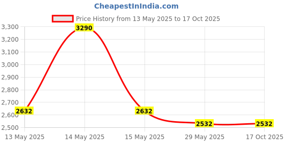 Good news! The current price of ₹2,532 is at its best ever level. Over the 156 day price history period, prices have ranged from ₹2,532 to ₹3,290, with an average of ₹2,724. The pricing shows moderate volatility, with prices remaining relatively stable overall. In terms of recent activity, there have been 0 price changes this week, 0 this month, and 3 over the past year. If you need this product now, it's a reasonable time to buy as prices are stable, but you might want to monitor for potential better deals.