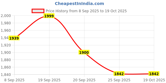Exciting update! The current price of ₹1,842 is at its best ever level. Over the 40 day price history period, prices have ranged from ₹1,842 to ₹1,999, with an average of ₹1,904. The pricing has been quite stable with low volatility, and the overall trend is favorable for consumers as prices are getting cheaper. In terms of recent activity, there have been 0 price changes this week, 2 this month, and 3 over the past year. If you need this product now, it's a reasonable time to buy as prices are stable, but you might want to monitor for potential better deals.