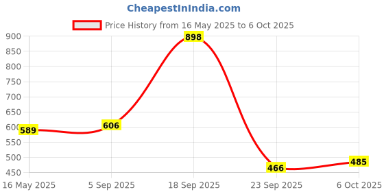 The current price is ₹485, which is ₹19 (4.1%) higher than the best price of ₹466 last seen on 23 Sep 2025. Over the 143 day price history period, prices have ranged from ₹466 to ₹898, with an average of ₹609. The pricing shows high volatility with significant fluctuations, and the overall trend is favorable for consumers as prices are getting cheaper. In terms of recent activity, there have been 0 price changes this week, 2 this month, and 4 over the past year. This is an excellent time to make a purchase as prices are trending downward and conditions appear favorable.