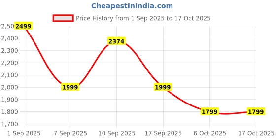 Fantastic! The current price of ₹1,799 is at its best ever level. Over the 45 day price history period, prices have ranged from ₹1,799 to ₹2,499, with an average of ₹2,078. The pricing shows moderate volatility, and the overall trend is favorable for consumers as prices are getting cheaper. In terms of recent activity, there have been 0 price changes this week, 1 this month, and 4 over the past year. This is an excellent time to make a purchase as prices are trending downward and conditions appear favorable.