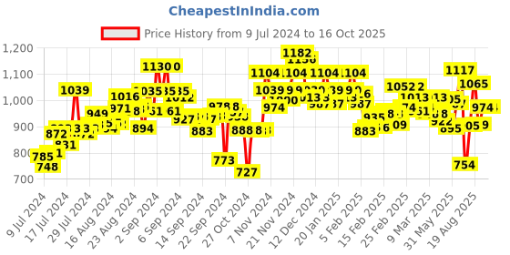 The current price is ₹974, which is ₹247 (34.0%) higher than the best price of ₹727 last seen on 27 Oct 2024. Over the 464 day price history period, prices have ranged from ₹727 to ₹1,182, with an average of ₹962. The pricing shows moderate volatility, but the overall trend is concerning as prices are getting more expensive. In terms of recent activity, there have been 0 price changes this week, 1 this month, and 53 over the past year. If you need this product now, it's a reasonable time to buy as prices are stable, but you might want to monitor for potential better deals.