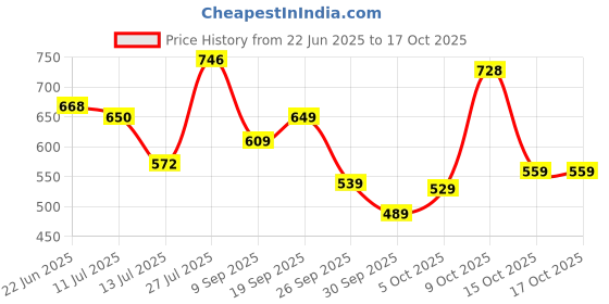 The current price is ₹559, which is ₹70 (14.3%) higher than the best price of ₹489 last seen on 30 Sep 2025. Over the 116 day price history period, prices have ranged from ₹489 to ₹746, with an average of ₹608. The pricing shows moderate volatility, and the overall trend is favorable for consumers as prices are getting cheaper. In terms of recent activity, there have been 0 price changes this week, 5 this month, and 10 over the past year. This is an excellent time to make a purchase as prices are trending downward and conditions appear favorable.