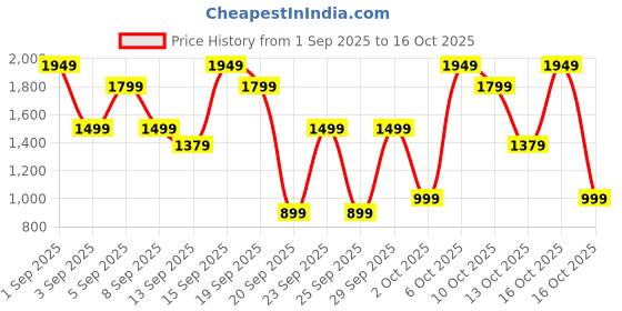 The current price is ₹1,949, which is ₹1,050 (116.8%) higher than the best price of ₹899 last seen on 20 Sep 2025. Over the 45 day price history period, prices have ranged from ₹899 to ₹1,949, with an average of ₹1,570. The pricing shows high volatility with significant fluctuations, with prices remaining relatively stable overall. In terms of recent activity, there have been 2 price changes this week, 9 this month, and 15 over the past year. The price direction is uncertain, so monitor the situation for a few more days before making a decision.