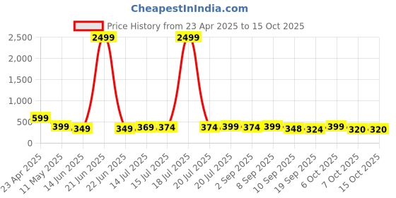 Fantastic! The current price of ₹320 is at its best ever level. Over the 174 day price history period, prices have ranged from ₹320 to ₹2,499, with an average of ₹629. The pricing shows high volatility with significant fluctuations, and the overall trend is favorable for consumers as prices are getting cheaper. In terms of recent activity, there have been 0 price changes this week, 2 this month, and 15 over the past year. If you need this product now, it's a reasonable time to buy as prices are stable, but you might want to monitor for potential better deals.