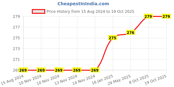 The current price is ₹279, which is ₹10 (3.7%) higher than the best price of ₹269 last seen on 10 Nov 2024. Over the 429 day price history period, prices have ranged from ₹269 to ₹279, with an average of ₹273. The pricing has been quite stable with low volatility, with prices remaining relatively stable overall. In terms of recent activity, there have been 0 price changes this week, 0 this month, and 6 over the past year. If you need this product now, it's a reasonable time to buy as prices are stable, but you might want to monitor for potential better deals.