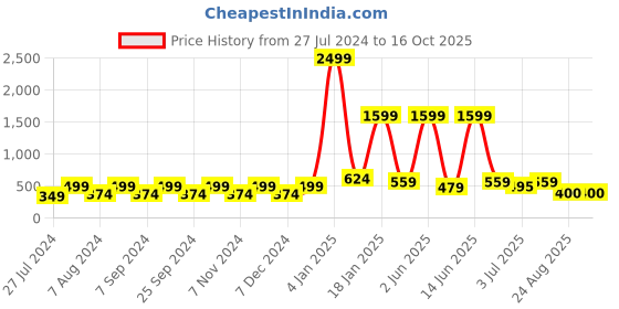 The current price is ₹400, which is ₹51 (14.6%) higher than the best price of ₹349 last seen on 27 Jul 2024. Over the 446 day price history period, prices have ranged from ₹349 to ₹2,499, with an average of ₹691. The pricing shows high volatility with significant fluctuations, but the overall trend is concerning as prices are getting more expensive. In terms of recent activity, there have been 0 price changes this week, 0 this month, and 14 over the past year. The price direction is uncertain, so monitor the situation for a few more days before making a decision.