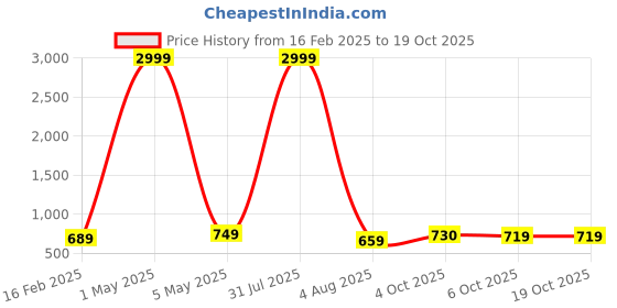 The current price is ₹719, which is ₹60 (9.1%) higher than the best price of ₹659 last seen on 4 Aug 2025. Over the 244 day price history period, prices have ranged from ₹659 to ₹2,999, with an average of ₹1,283. The pricing shows high volatility with significant fluctuations, with prices remaining relatively stable overall. In terms of recent activity, there have been 0 price changes this week, 1 this month, and 6 over the past year. If you need this product now, it's a reasonable time to buy as prices are stable, but you might want to monitor for potential better deals.