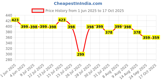 The current price is ₹359, which is ₹60 (20.1%) higher than the best price of ₹299 last seen on 26 Jul 2025. Over the 137 day price history period, prices have ranged from ₹299 to ₹423, with an average of ₹388. The pricing shows moderate volatility, and the overall trend is favorable for consumers as prices are getting cheaper. In terms of recent activity, there have been 0 price changes this week, 0 this month, and 14 over the past year. If you need this product now, it's a reasonable time to buy as prices are stable, but you might want to monitor for potential better deals.
