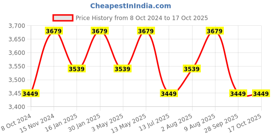 Good news! The current price of ₹3,449 is at its best ever level. Over the 373 day price history period, prices have ranged from ₹3,449 to ₹3,679, with an average of ₹3,557. The pricing has been quite stable with low volatility, with prices remaining relatively stable overall. In terms of recent activity, there have been 0 price changes this week, 0 this month, and 8 over the past year. The price direction is uncertain, so monitor the situation for a few more days before making a decision.