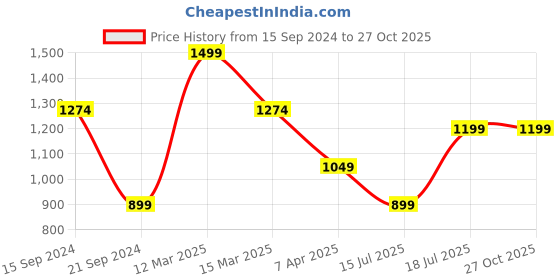 The current price is ₹1,199, which is ₹300 (33.4%) higher than the best price of ₹899 last seen on 21 Sep 2024. Over the 407 day price history period, prices have ranged from ₹899 to ₹1,499, with an average of ₹1,162. The pricing shows high volatility with significant fluctuations, and the overall trend is favorable for consumers as prices are getting cheaper. In terms of recent activity, there have been 0 price changes this week, 0 this month, and 4 over the past year. The price direction is uncertain, so monitor the situation for a few more days before making a decision.