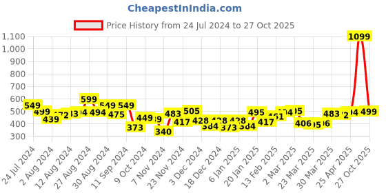 The current price is ₹499, which is ₹159 (46.8%) higher than the best price of ₹340 last seen on 7 Nov 2024. Over the 460 day price history period, prices have ranged from ₹340 to ₹1,099, with an average of ₹477. The pricing shows high volatility with significant fluctuations, and the overall trend is favorable for consumers as prices are getting cheaper. In terms of recent activity, there have been 0 price changes this week, 0 this month, and 22 over the past year. If you need this product now, it's a reasonable time to buy as prices are stable, but you might want to monitor for potential better deals.