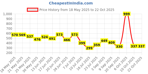 The current price is ₹337, which is ₹38 (12.7%) higher than the best price of ₹299 last seen on 16 Jul 2025. Over the 156 day price history period, prices have ranged from ₹299 to ₹999, with an average of ₹483. The pricing shows high volatility with significant fluctuations, and the overall trend is favorable for consumers as prices are getting cheaper. In terms of recent activity, there have been 0 price changes this week, 1 this month, and 16 over the past year. This is an excellent time to make a purchase as prices are trending downward and conditions appear favorable.
