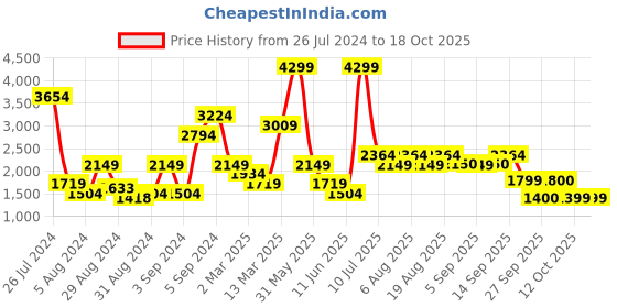 Great news for shoppers! The current price of ₹1,399 is at its best ever level. Over the 449 day price history period, prices have ranged from ₹1,399 to ₹4,299, with an average of ₹2,177. The pricing shows high volatility with significant fluctuations, and the overall trend is favorable for consumers as prices are getting cheaper. In terms of recent activity, there have been 0 price changes this week, 3 this month, and 20 over the past year. This is an excellent time to make a purchase as prices are trending downward and conditions appear favorable.
