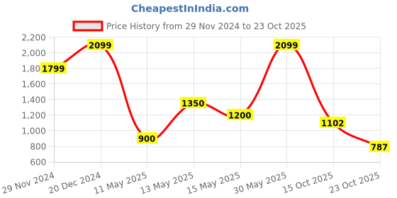 Exciting update! The current price of ₹787 is at its best ever level. Over the 328 day price history period, prices have ranged from ₹787 to ₹2,099, with an average of ₹1,417. The pricing shows high volatility with significant fluctuations, and the overall trend is favorable for consumers as prices are getting cheaper. In terms of recent activity, there have been 0 price changes this week, 1 this month, and 7 over the past year. This is an excellent time to make a purchase as prices are trending downward and conditions appear favorable.