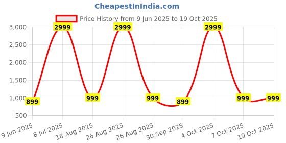 The current price is ₹999, which is ₹100 (11.1%) higher than the best price of ₹899 last seen on 9 Jun 2025. Over the 131 day price history period, prices have ranged from ₹899 to ₹2,999, with an average of ₹1,643. The pricing shows high volatility with significant fluctuations, but the overall trend is concerning as prices are getting more expensive. In terms of recent activity, there have been 0 price changes this week, 2 this month, and 7 over the past year. The price direction is uncertain, so monitor the situation for a few more days before making a decision.
