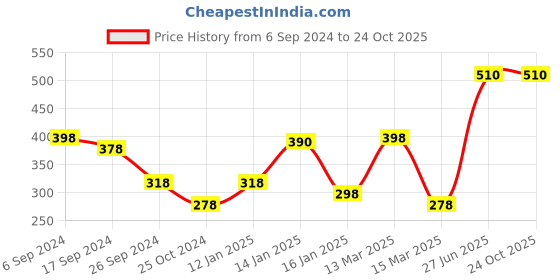 The current price is ₹510, which is ₹232 (83.5%) higher than the best price of ₹278 last seen on 25 Oct 2024. Over the 413 day price history period, prices have ranged from ₹278 to ₹510, with an average of ₹370. The pricing shows high volatility with significant fluctuations, but the overall trend is concerning as prices are getting more expensive. In terms of recent activity, there have been 0 price changes this week, 0 this month, and 6 over the past year. Consider waiting before making a purchase as prices are rising and better deals may be available later.