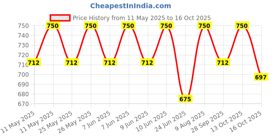 The current price is ₹697, which is ₹22 (3.3%) higher than the best price of ₹675 last seen on 24 Jun 2025. Over the 158 day price history period, prices have ranged from ₹675 to ₹750, with an average of ₹726. The pricing has been quite stable with low volatility, with prices remaining relatively stable overall. In terms of recent activity, there has been 1 price change this week, 2 this month, and 12 over the past year. If you need this product now, it's a reasonable time to buy as prices are stable, but you might want to monitor for potential better deals.