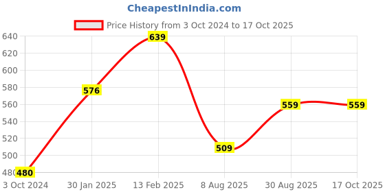 The current price is ₹559, which is ₹79 (16.5%) higher than the best price of ₹480 last seen on 3 Oct 2024. Over the 378 day price history period, prices have ranged from ₹480 to ₹639, with an average of ₹554. The pricing shows moderate volatility, but the overall trend is concerning as prices are getting more expensive. In terms of recent activity, there have been 0 price changes this week, 0 this month, and 3 over the past year. If you need this product now, it's a reasonable time to buy as prices are stable, but you might want to monitor for potential better deals.