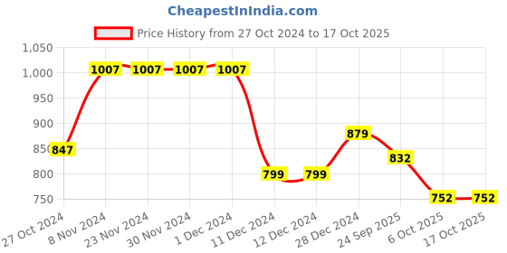 Great news for shoppers! The current price of ₹752 is at its best ever level. Over the 354 day price history period, prices have ranged from ₹752 to ₹1,007.37, with an average of ₹881. The pricing shows moderate volatility, and the overall trend is favorable for consumers as prices are getting cheaper. In terms of recent activity, there have been 0 price changes this week, 1 this month, and 9 over the past year. If you need this product now, it's a reasonable time to buy as prices are stable, but you might want to monitor for potential better deals.