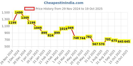 The current price is ₹645, which is ₹78 (13.8%) higher than the best price of ₹567 last seen on 31 Jul 2025. Over the 323 day price history period, prices have ranged from ₹567 to ₹1,499, with an average of ₹898. The pricing shows high volatility with significant fluctuations, and the overall trend is favorable for consumers as prices are getting cheaper. In terms of recent activity, there have been 0 price changes this week, 0 this month, and 17 over the past year. If you need this product now, it's a reasonable time to buy as prices are stable, but you might want to monitor for potential better deals.