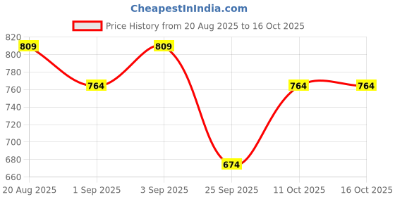 The current price is ₹764, which is ₹90 (13.4%) higher than the best price of ₹674 last seen on 25 Sep 2025. Over the 56 day price history period, prices have ranged from ₹674 to ₹809, with an average of ₹764. The pricing shows moderate volatility, and the overall trend is favorable for consumers as prices are getting cheaper. In terms of recent activity, there have been 0 price changes this week, 1 this month, and 4 over the past year. If you need this product now, it's a reasonable time to buy as prices are stable, but you might want to monitor for potential better deals.