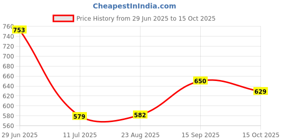The current price is ₹629, which is ₹50 (8.6%) higher than the best price of ₹579 last seen on 11 Jul 2025. Over the 108 day price history period, prices have ranged from ₹579 to ₹753, with an average of ₹639. The pricing shows moderate volatility, and the overall trend is favorable for consumers as prices are getting cheaper. In terms of recent activity, there have been 0 price changes this week, 0 this month, and 4 over the past year. If you need this product now, it's a reasonable time to buy as prices are stable, but you might want to monitor for potential better deals.