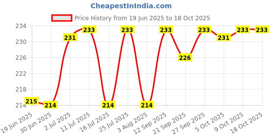 The current price is ₹233, which is ₹19 (8.9%) higher than the best price of ₹214 last seen on 30 Jun 2025. Over the 121 day price history period, prices have ranged from ₹214 to ₹233, with an average of ₹226. The pricing has been quite stable with low volatility, but the overall trend is concerning as prices are getting more expensive. In terms of recent activity, there have been 0 price changes this week, 3 this month, and 11 over the past year. If you need this product now, it's a reasonable time to buy as prices are stable, but you might want to monitor for potential better deals.