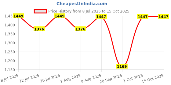 The current price is ₹1,447, which is ₹278 (23.8%) higher than the best price of ₹1,169 last seen on 28 Sep 2025. Over the 99 day price history period, prices have ranged from ₹1,169 to ₹1,449, with an average of ₹1,395. The pricing shows moderate volatility, with prices remaining relatively stable overall. In terms of recent activity, there have been 0 price changes this week, 1 this month, and 6 over the past year. The price direction is uncertain, so monitor the situation for a few more days before making a decision.