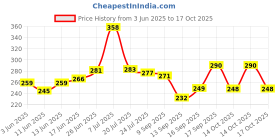 The current price is ₹248, which is ₹16 (6.9%) higher than the best price of ₹232 last seen on 13 Sep 2025. Over the 136 day price history period, prices have ranged from ₹232 to ₹358, with an average of ₹270. The pricing shows moderate volatility, with prices remaining relatively stable overall. In terms of recent activity, there have been 2 price changes this week, 2 this month, and 14 over the past year. If you need this product now, it's a reasonable time to buy as prices are stable, but you might want to monitor for potential better deals.