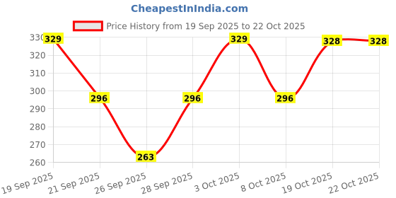 The current price is ₹328, which is ₹65 (24.7%) higher than the best price of ₹263 last seen on 26 Sep 2025. Over the 32 day price history period, prices have ranged from ₹263 to ₹329, with an average of ₹308. The pricing shows moderate volatility, with prices remaining relatively stable overall. In terms of recent activity, there have been 0 price changes this week, 4 this month, and 6 over the past year. If you need this product now, it's a reasonable time to buy as prices are stable, but you might want to monitor for potential better deals.