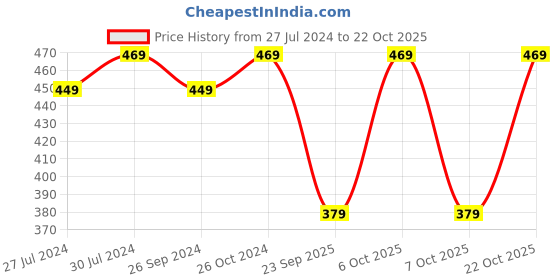 Great news for shoppers! The current price of ₹379 is at its best ever level. Over the 451 day price history period, prices have ranged from ₹379 to ₹469, with an average of ₹430. The pricing shows moderate volatility, and the overall trend is favorable for consumers as prices are getting cheaper. In terms of recent activity, there have been 0 price changes this week, 2 this month, and 3 over the past year. If you need this product now, it's a reasonable time to buy as prices are stable, but you might want to monitor for potential better deals.
