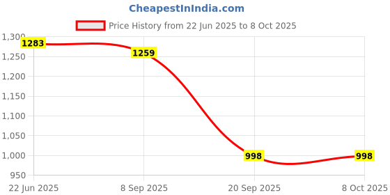 Exciting update! The current price of ₹998 is at its best ever level. Over the 107 day price history period, prices have ranged from ₹998 to ₹1,283, with an average of ₹1,135. The pricing shows moderate volatility, and the overall trend is favorable for consumers as prices are getting cheaper. In terms of recent activity, there have been 0 price changes this week, 1 this month, and 2 over the past year. This is an excellent time to make a purchase as prices are trending downward and conditions appear favorable.