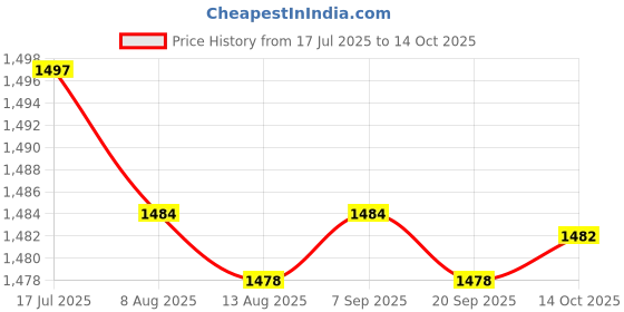 The current price is ₹1,482, which is ₹4 (0.3%) higher than the best price of ₹1,478 last seen on 13 Aug 2025. Over the 89 day price history period, prices have ranged from ₹1,478 to ₹1,497, with an average of ₹1,484. The pricing has been quite stable with low volatility, with prices remaining relatively stable overall. In terms of recent activity, there have been 0 price changes this week, 1 this month, and 5 over the past year. If you need this product now, it's a reasonable time to buy as prices are stable, but you might want to monitor for potential better deals.
