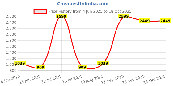 The current price is ₹2,449, which is ₹1,540 (169.4%) higher than the best price of ₹909 last seen on 13 Jun 2025. Over the 136 day price history period, prices have ranged from ₹909 to ₹2,599, with an average of ₹1,749. The pricing shows high volatility with significant fluctuations, but the overall trend is concerning as prices are getting more expensive. In terms of recent activity, there have been 0 price changes this week, 0 this month, and 6 over the past year. The price direction is uncertain, so monitor the situation for a few more days before making a decision.