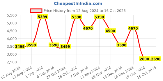 Exciting update! The current price of ₹2,690 is at its best ever level. Over the 429 day price history period, prices have ranged from ₹2,690 to ₹5,399, with an average of ₹4,090. The pricing shows high volatility with significant fluctuations, and the overall trend is favorable for consumers as prices are getting cheaper. In terms of recent activity, there have been 0 price changes this week, 0 this month, and 7 over the past year. This is an excellent time to make a purchase as prices are trending downward and conditions appear favorable.