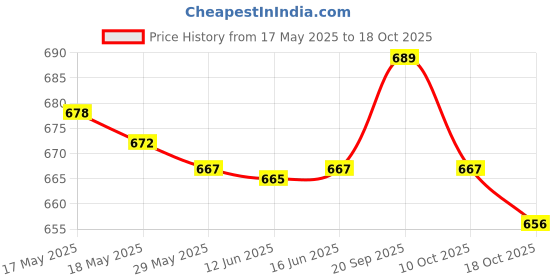 The current price is ₹667, which is ₹2 (0.3%) higher than the best price of ₹665 last seen on 12 Jun 2025. Over the 154 day price history period, prices have ranged from ₹665 to ₹689, with an average of ₹672. The pricing has been quite stable with low volatility, with prices remaining relatively stable overall. In terms of recent activity, there have been 0 price changes this week, 1 this month, and 6 over the past year. If you need this product now, it's a reasonable time to buy as prices are stable, but you might want to monitor for potential better deals.