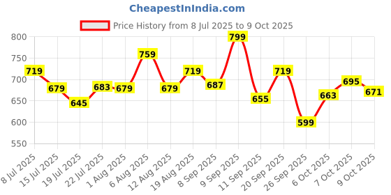The current price is ₹671, which is ₹72 (12.0%) higher than the best price of ₹599 last seen on 26 Sep 2025. Over the 93 day price history period, prices have ranged from ₹599 to ₹799, with an average of ₹691. The pricing shows moderate volatility, and the overall trend is favorable for consumers as prices are getting cheaper. In terms of recent activity, there have been 0 price changes this week, 4 this month, and 15 over the past year. If you need this product now, it's a reasonable time to buy as prices are stable, but you might want to monitor for potential better deals.
