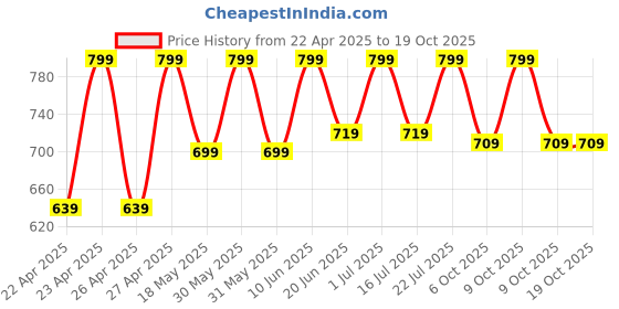 The current price is ₹709, which is ₹70 (11.0%) higher than the best price of ₹639 last seen on 22 Apr 2025. Over the 179 day price history period, prices have ranged from ₹639 to ₹799, with an average of ₹740. The pricing shows moderate volatility, but the overall trend is concerning as prices are getting more expensive. In terms of recent activity, there have been 0 price changes this week, 2 this month, and 14 over the past year. If you need this product now, it's a reasonable time to buy as prices are stable, but you might want to monitor for potential better deals.